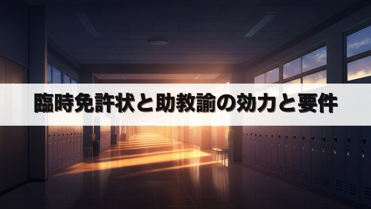 ただし、助教諭は単独で学級経営や成績評価を行うことができず、常に教諭の指導下で職務を遂行する点が臨時免許状との大きな違いです。