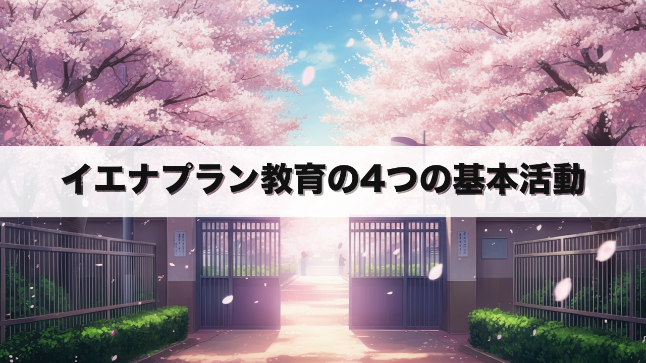 解説: イエナプラン教育は対話・遊び・仕事・催しを4つの基本活動とし、一斉授業ではなく子ども主体の活動を重視します。